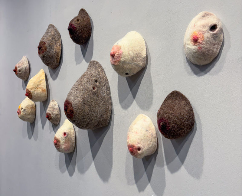 This body of experimental fiber works began during the pandemic, when stitching became a way to anchor myself while teaching online and spending time in nature. The early embroideries connected the meditative rhythm of handwork with the immersive experience of being engulfed by the landscape. More recent works expand this exploration through felted forms of the female body, particularly breasts, deepening my ongoing investigation of the body’s connection to the natural world. Across stitching and felting, these pieces embrace tactility, slowness, and embodiment as ways of entering into dialogue with both the self and the environment.